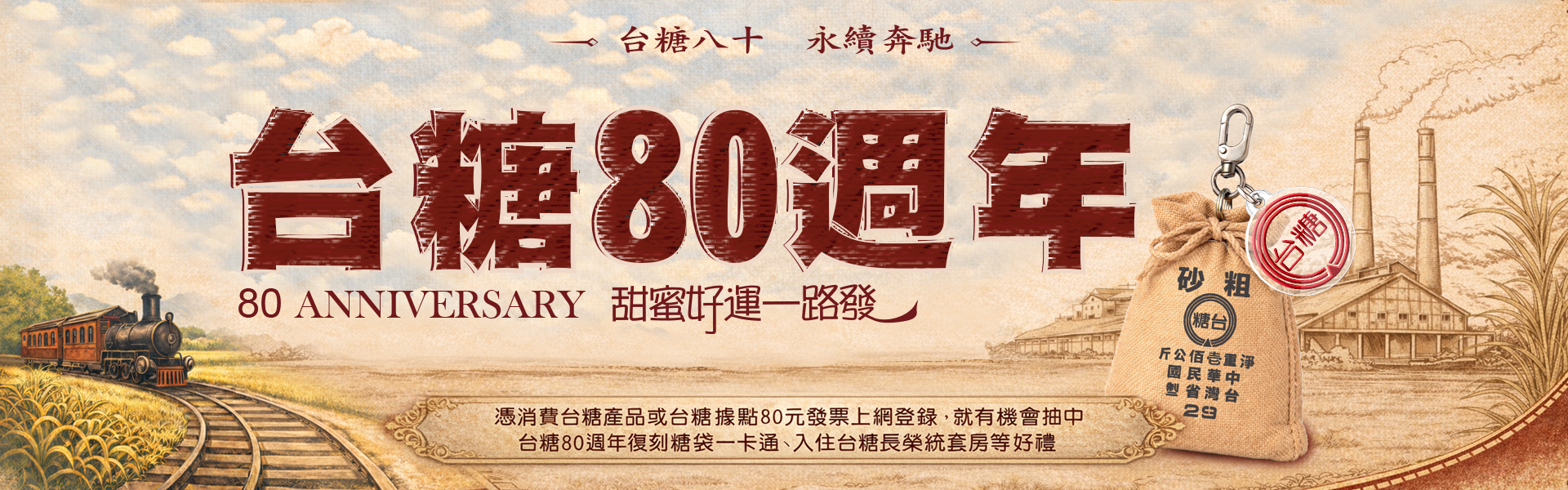 為慶祝台糖成立 80 週年,特別推出期間限定的「台糖80週年慶抽獎活動」,讓民眾在日常消費的同時,也能參加豐富好禮抽獎。活動期間自 115年4月1日至6月30日,共計 3個月,只要簡單消費並完成發票登錄,就有機會抽中住宿劵、美容保養品、保健食品、咖啡禮盒及加油券等多項好禮,最大獎更可獲得超豪華的「台糖飯店住到爽」住宿組合,享受頂級渡假體驗。